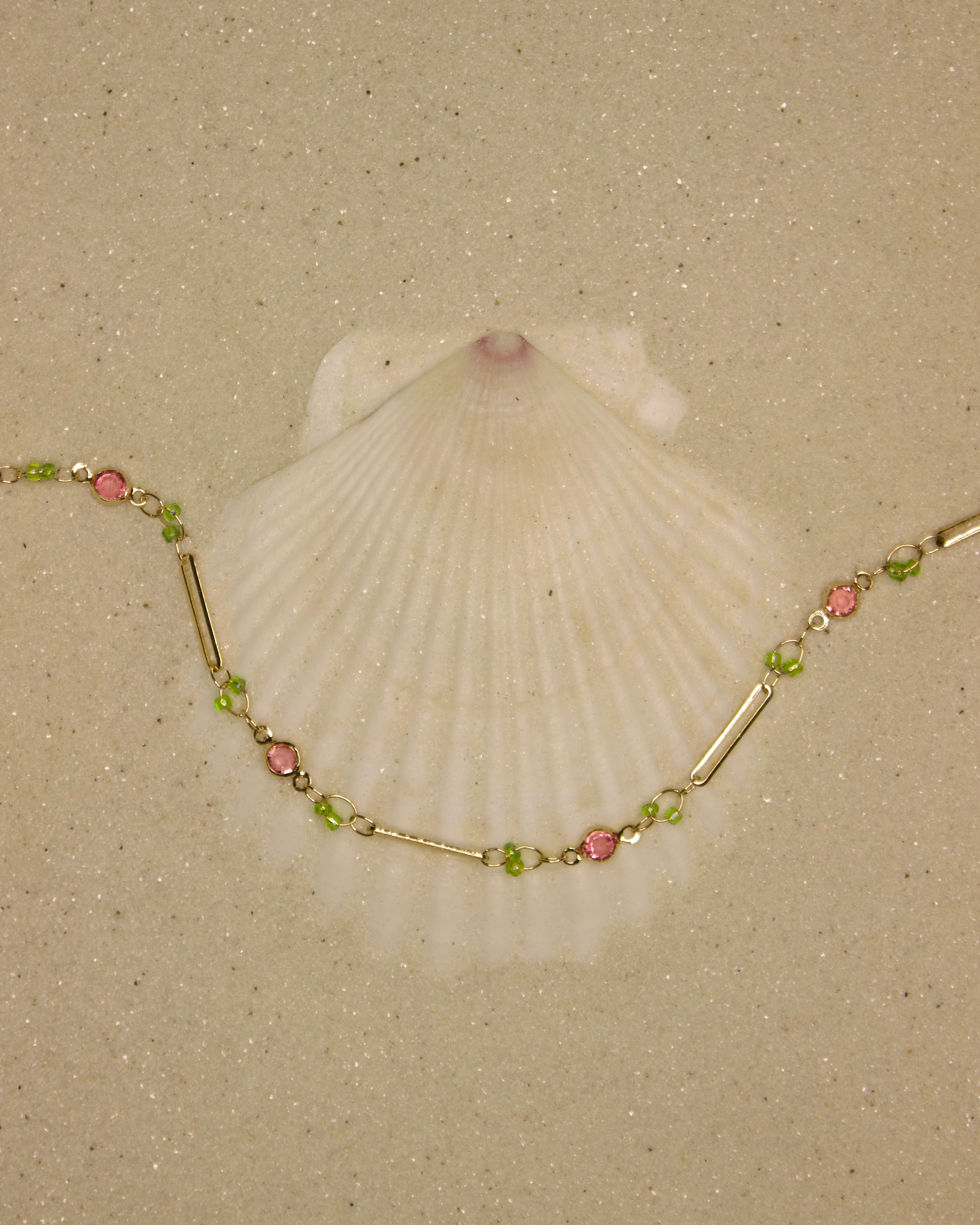 Step into a delightful picnic with the enchanting Magic Peaches Chain. This gold chain is adorned with crystals and beaded leaves that each resemble a pink peach. Indulge in the golden embrace of the Magic Peaches Chain, and let your style remind you of a cute world where peaches are ripe and the summer is sweet.